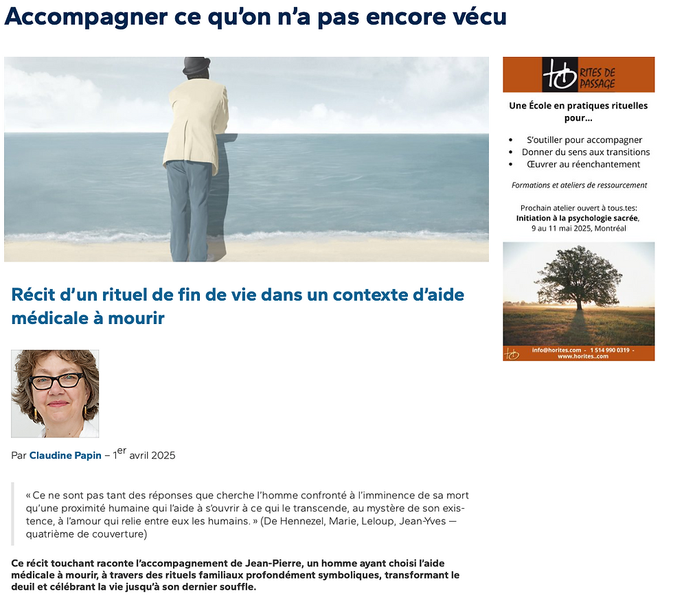 Et puisque le sujet vous intéresse, jetez un coup d’œil aux autres articles de cet excellent numéro de Spiritualitésanté consacré aux rituels de fin de vie en milieu de santé.